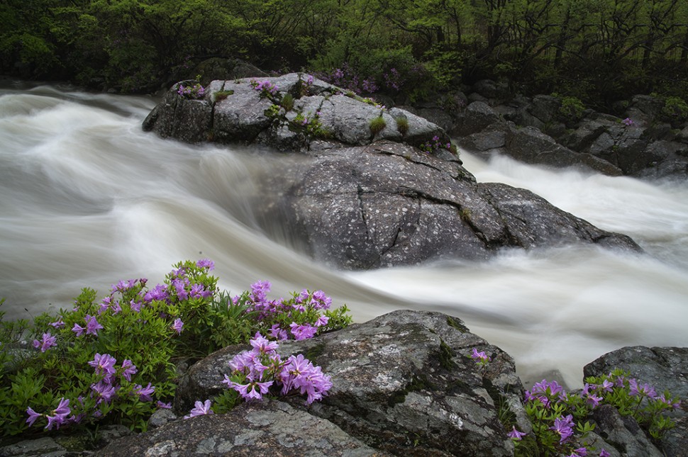 수 달래가 비를 맞으며 계곡의 물과 춤을 추고있습니다.