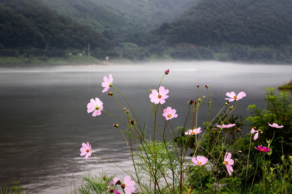 물안개와 코스모스가 평온함을 선사하네요