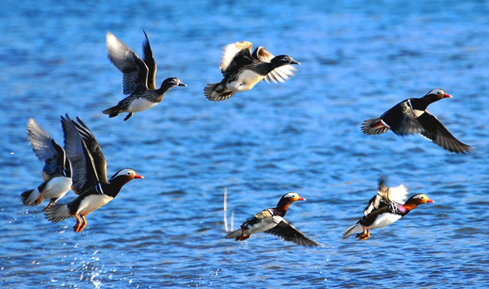 원앙새들이 날아가는 모습